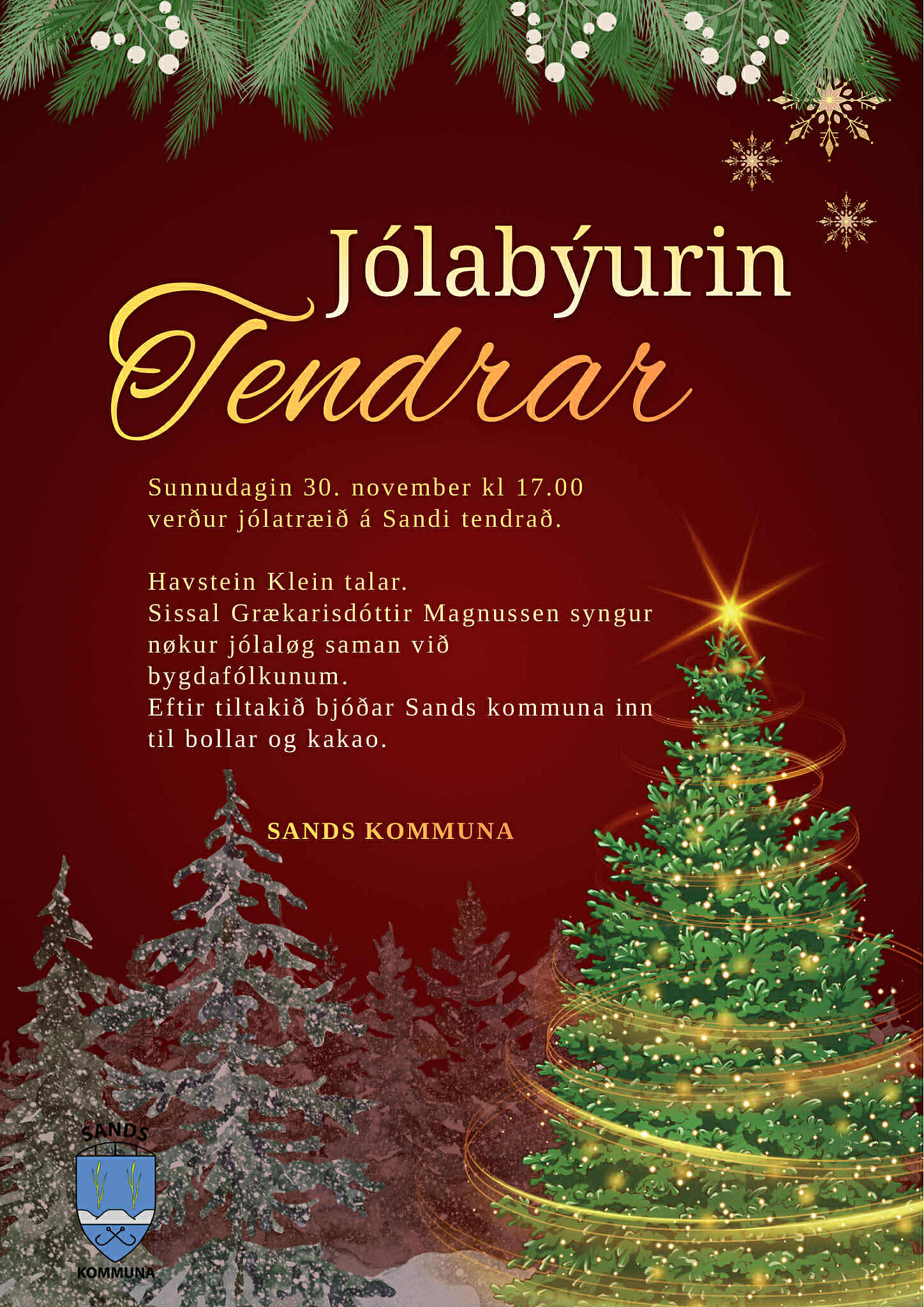 Í dag klokkan 17.00 verður jólatræið á Sandi tendrað