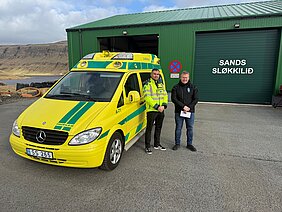 Á myndini, sum er tikin í gjár, eru Louis Hansen, frá Sjúkraflutnings-tænastuni á LS og borgarstjórin á Sandi, Kristian Oskar Henriksen.